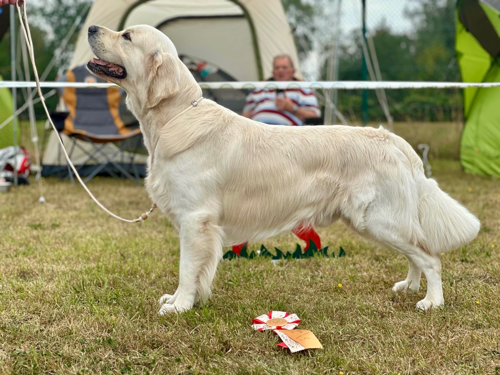 Gut entwickelter 13 Monate alter Rüde, 1a Haar- und Knochenstärke, gut geschnittener Rüdenkopf, etwas große Behänge, lobenswert sind Hals und Schulterpartie, korrekte Außenlinien und Winkelungen, guter Raumgriff, vorn noch etwas eng gehend.